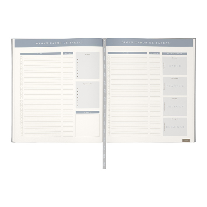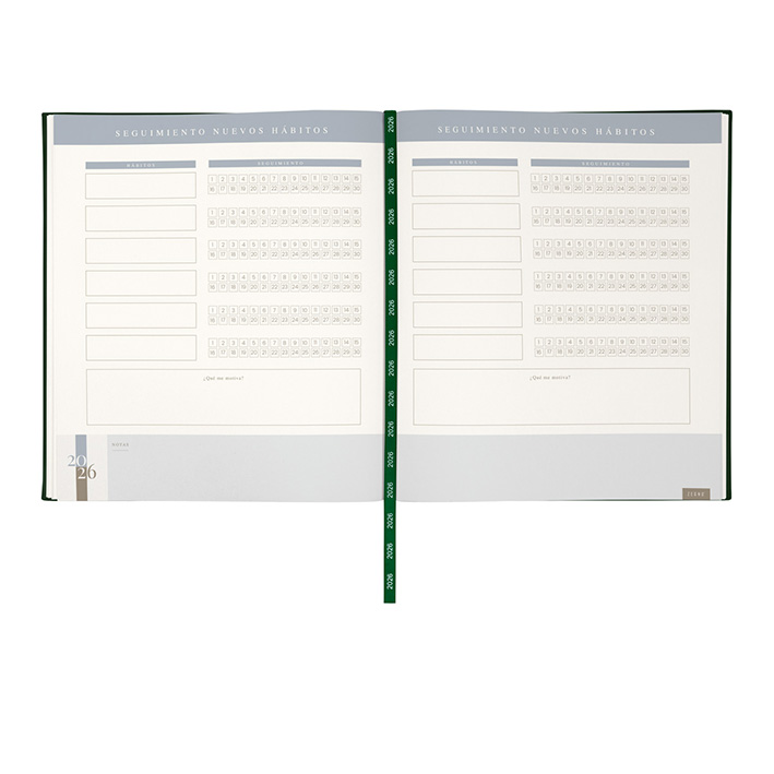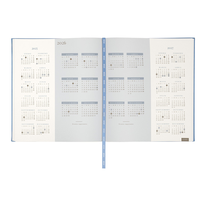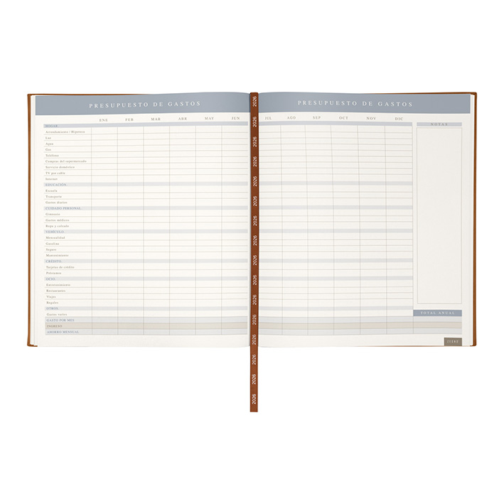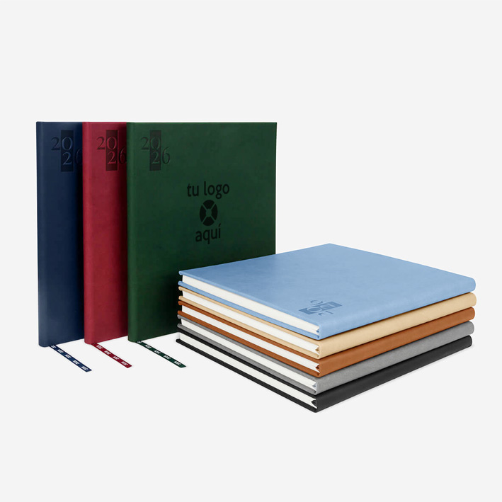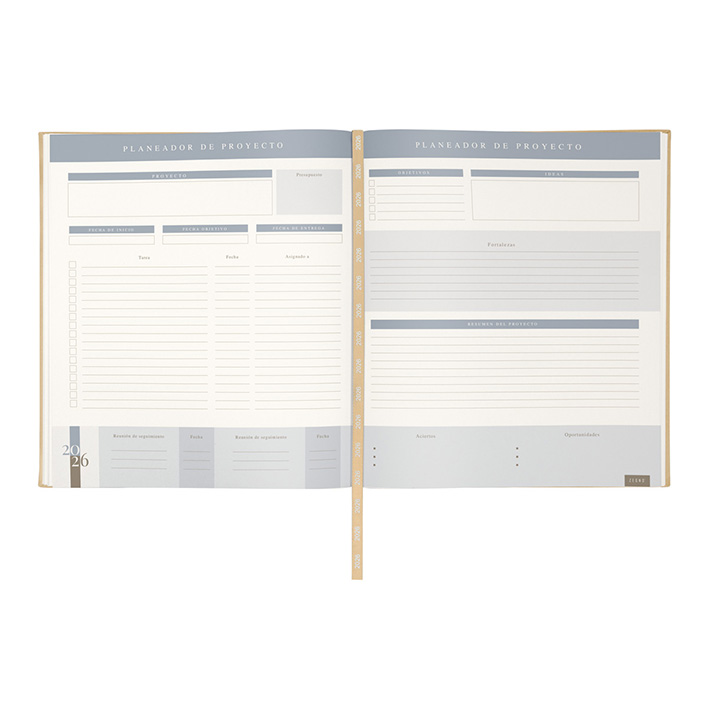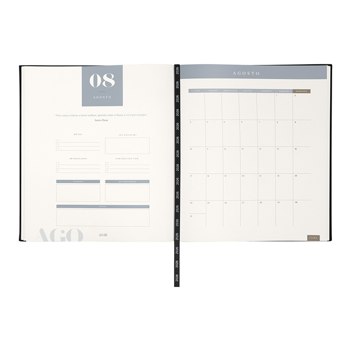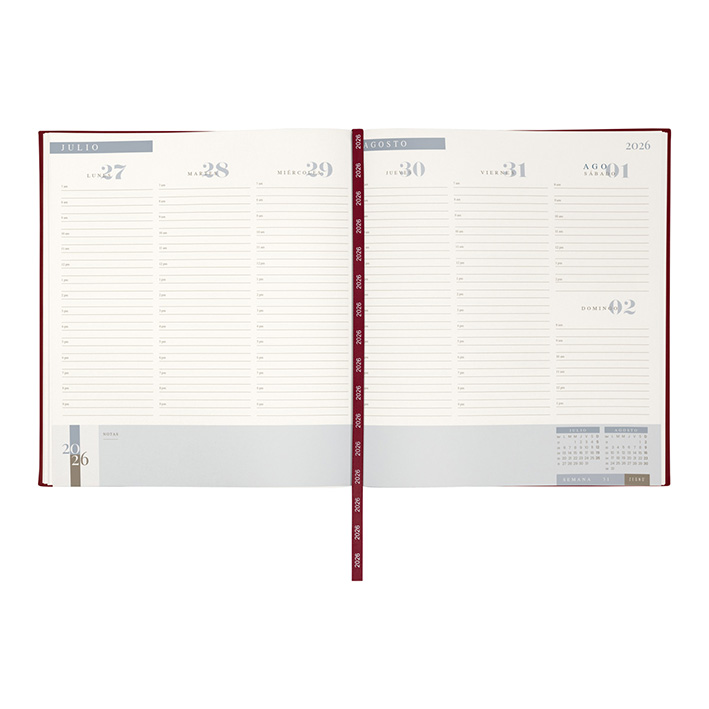 Agenda ejecutiva semanal con 80 hojas. Contiene datos personales, calendarios 2025-2026-2027, planeador 2026, presupuesto de gastos, seguimiento de nuevos hábitos, organizador de tareas, planeador de proyecto y días festivos. Incluye caja individual.