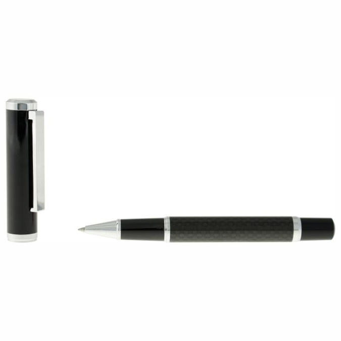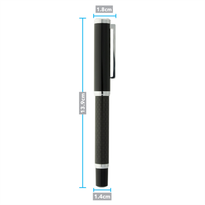 Bolígrafo metálico con tapón que cierra a presión. Acabado negro brillante. Detalles color cromo y cuerpo de fibra de carbono que le da ese singular diseño cuadriculado. Escritura de alto desempeño debido a su repuesto japonés tipo roller (a elegir entre tinta negra o azul). Incluye estuche individual.