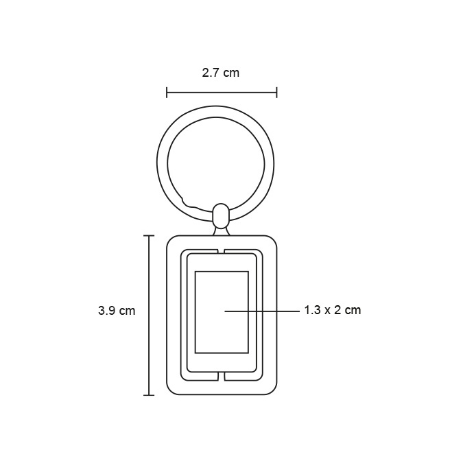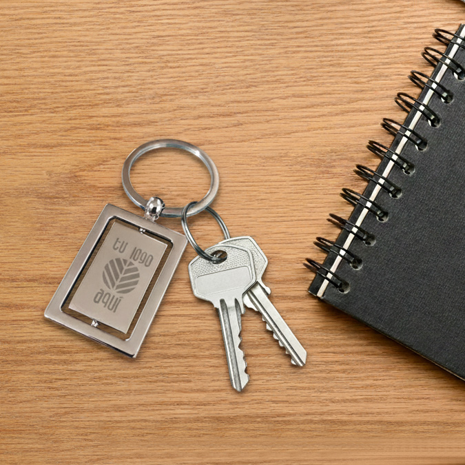 Llavero metálico de forma rectangular con centro giratorio y aro reforzado. Incluye caja.